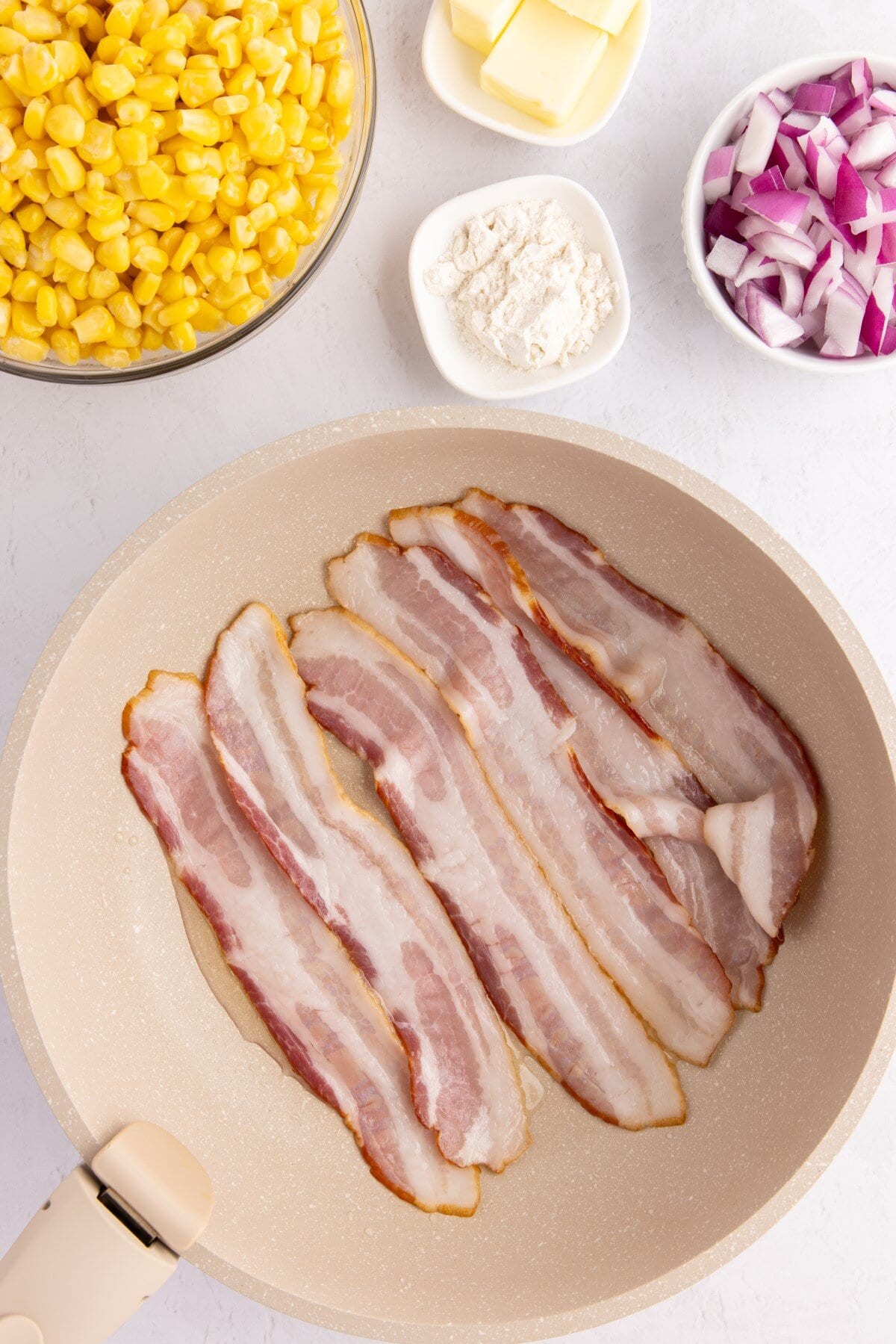 - In a large deep skillet, heat the oil on medium-high and add the bacon in a single layer. Separate into two batches if needed.